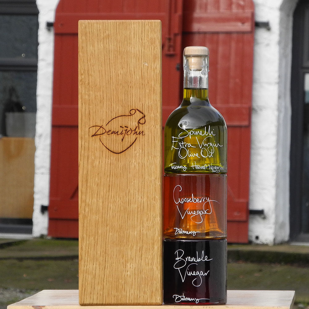 This generous gift set is compromised of three beautiful Impilabile 250ml stacking bottles which have been filled with our light and peppery Villa Montalbano Extra Virgin Olive Oil from Tuscany, our one of kind Gooseberry Vinegar and our fruity Bramble Vinegar, both of which are from Edinburgh.