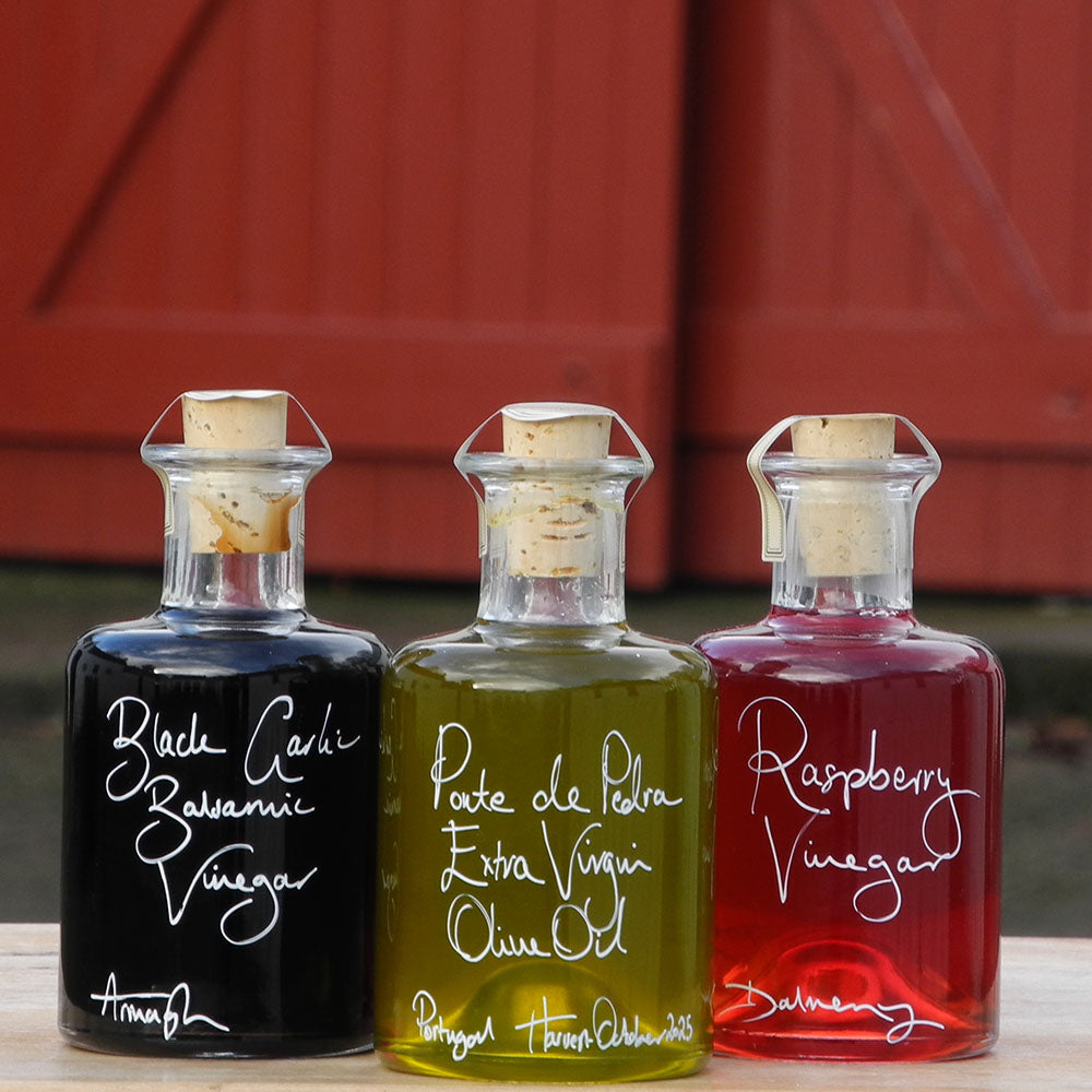 We have filled three of our delightful Apotheker 200ml bottles with our fresh Ponte de Pedra Extra Virgin Olive Oil from Portugal, our deliciously versatile Black Garlic Balsamic Vinegar from Armagh and our ridiculously fruity Raspberry Vinegar from Dalmeny.